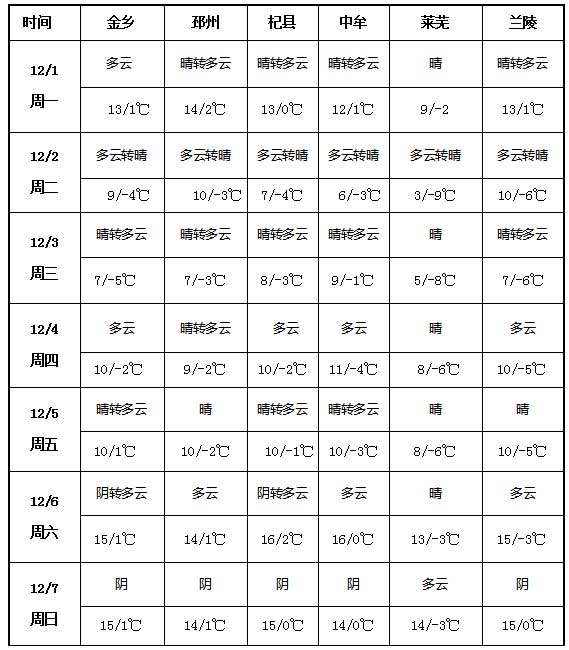 未來一周(12月1日-7日),金鄉、邳州、杞縣、中牟、萊蕪、蘭陵六大產區天氣將以晴朗或多云為主,整體天氣狀況良好,周內基本無降水。